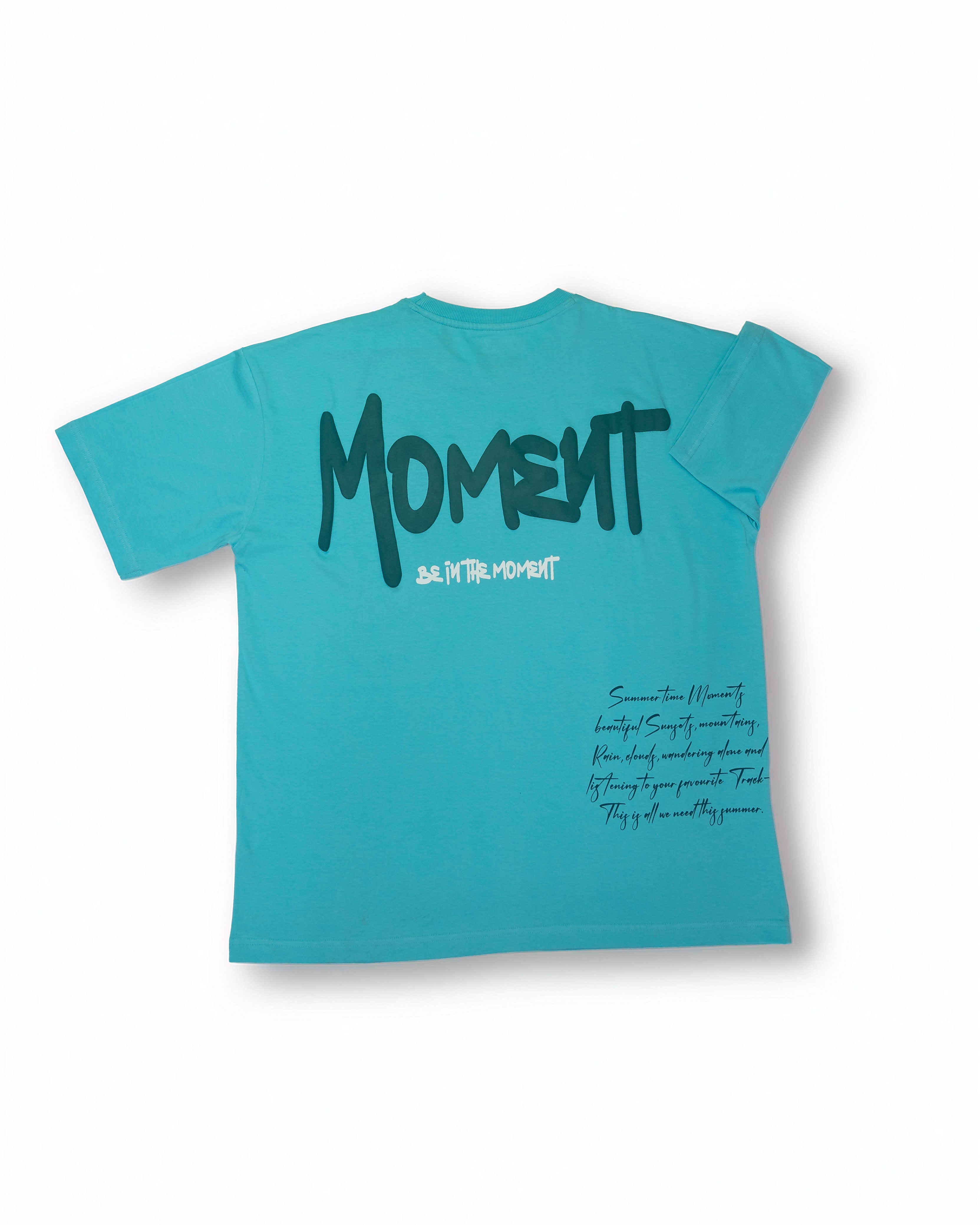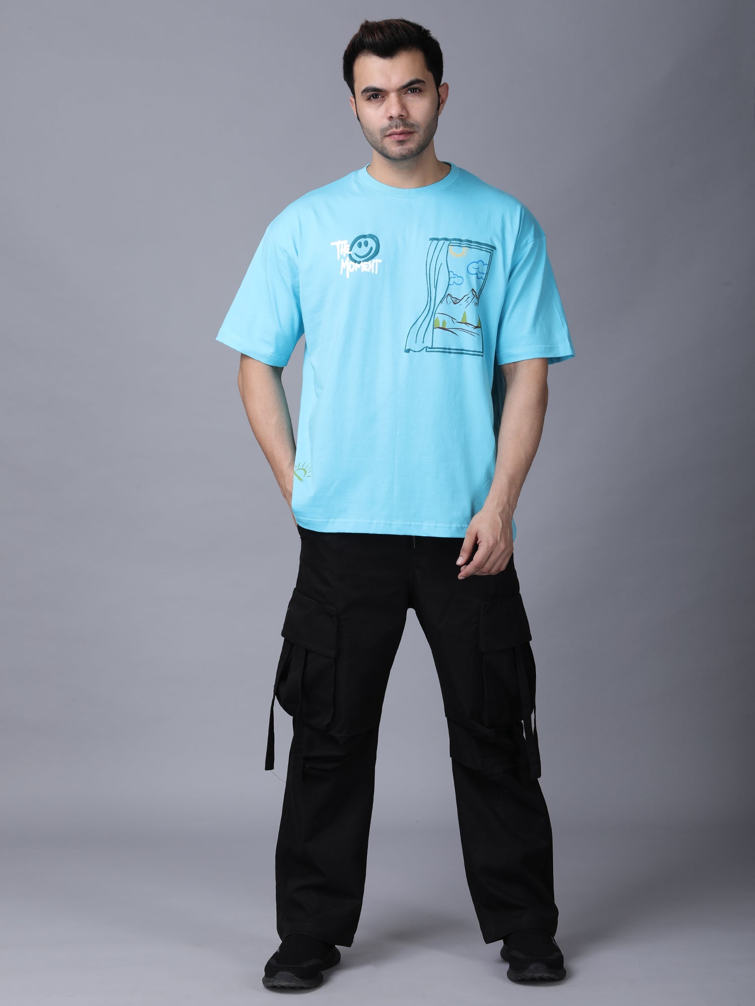 Embrace laid-back everyday style with this aqua blue oversized T-shirt, crafted from soft, breathable organic cotton. Featuring a whimsical graphic tee design of a serene mountain sunrise through a window, it invites mindfulness in motion. The cheerful "The Moment" lettering and quirky smiley graphic add feel-good fashion energy. With its relaxed fit streetwear vibe, this casual unisex tee is perfect for lounging, exploring, or pairing with cargos and sneakers for an effortlessly cool look.