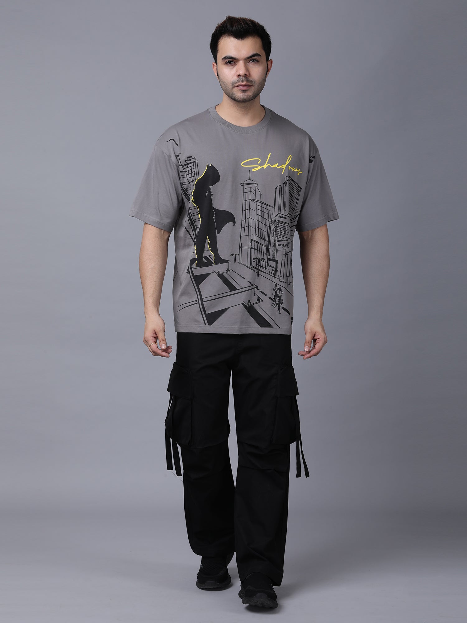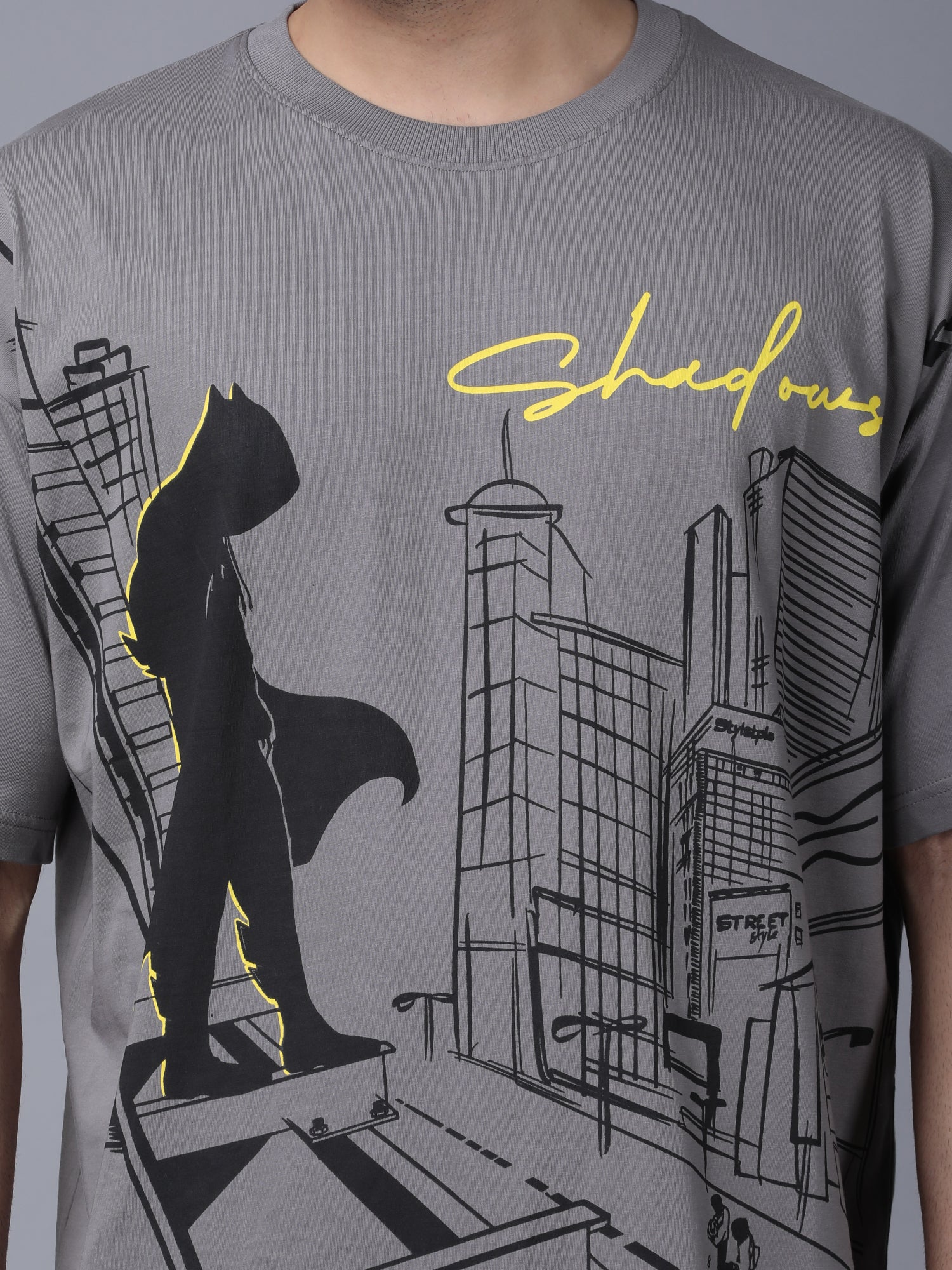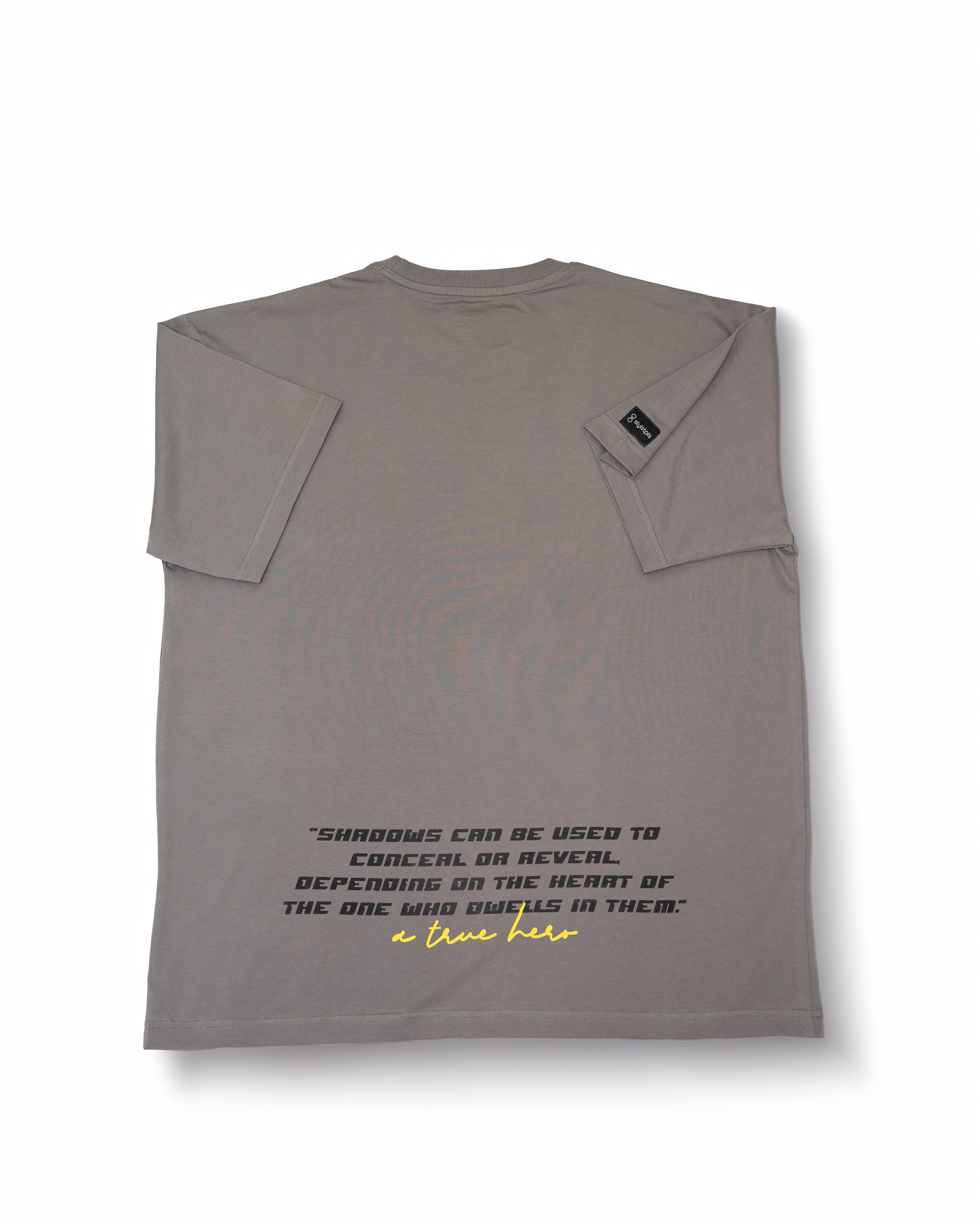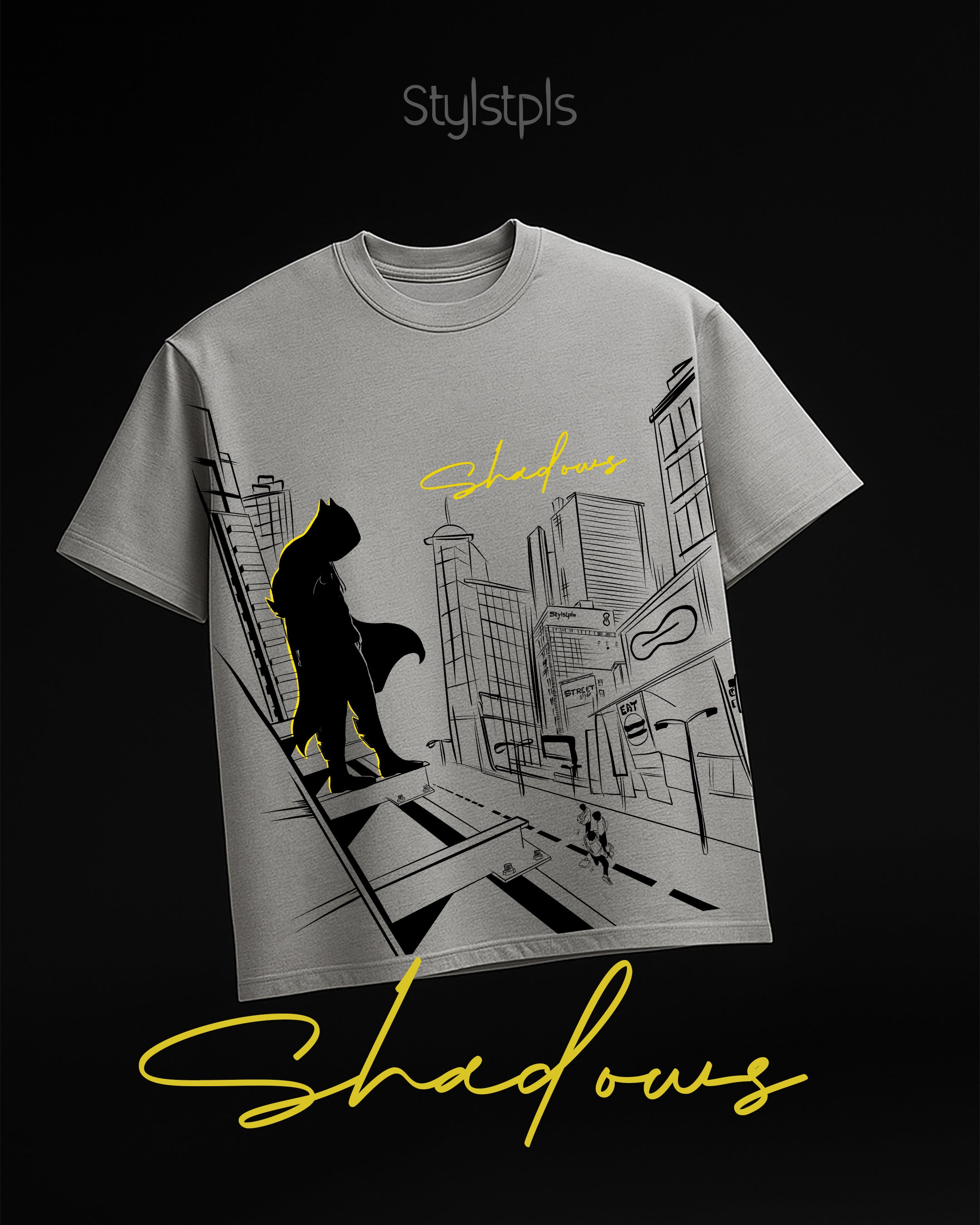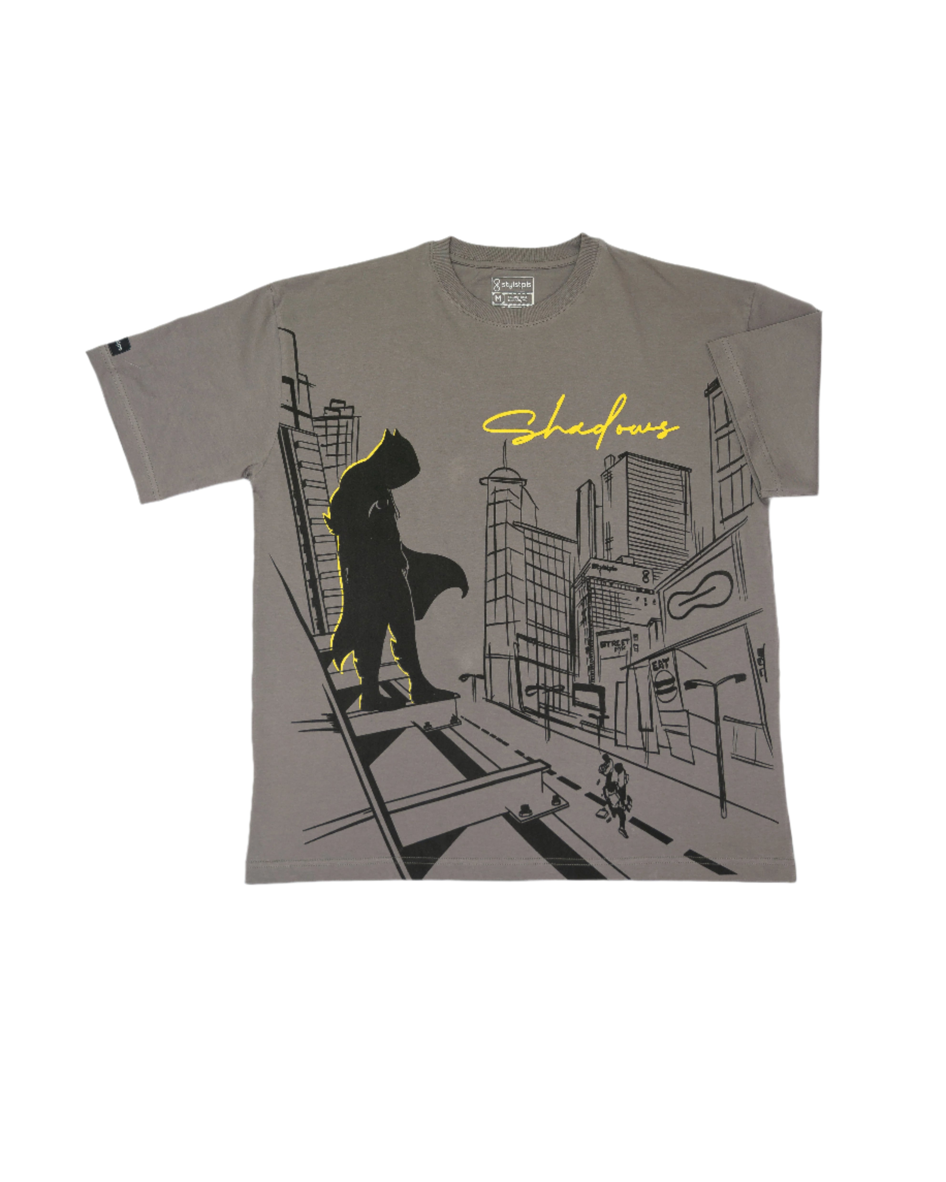 Celebrate silent strength with the Shadows T-shirt, featuring “Anyone Can Be a Hero in the Shadows” on the front. This grey graphic tee showcases a bold black screen print of a lone vigilante above city chaos, accented with striking yellow highlights. A perfect pick for those who embody quiet courage and urban heroism.